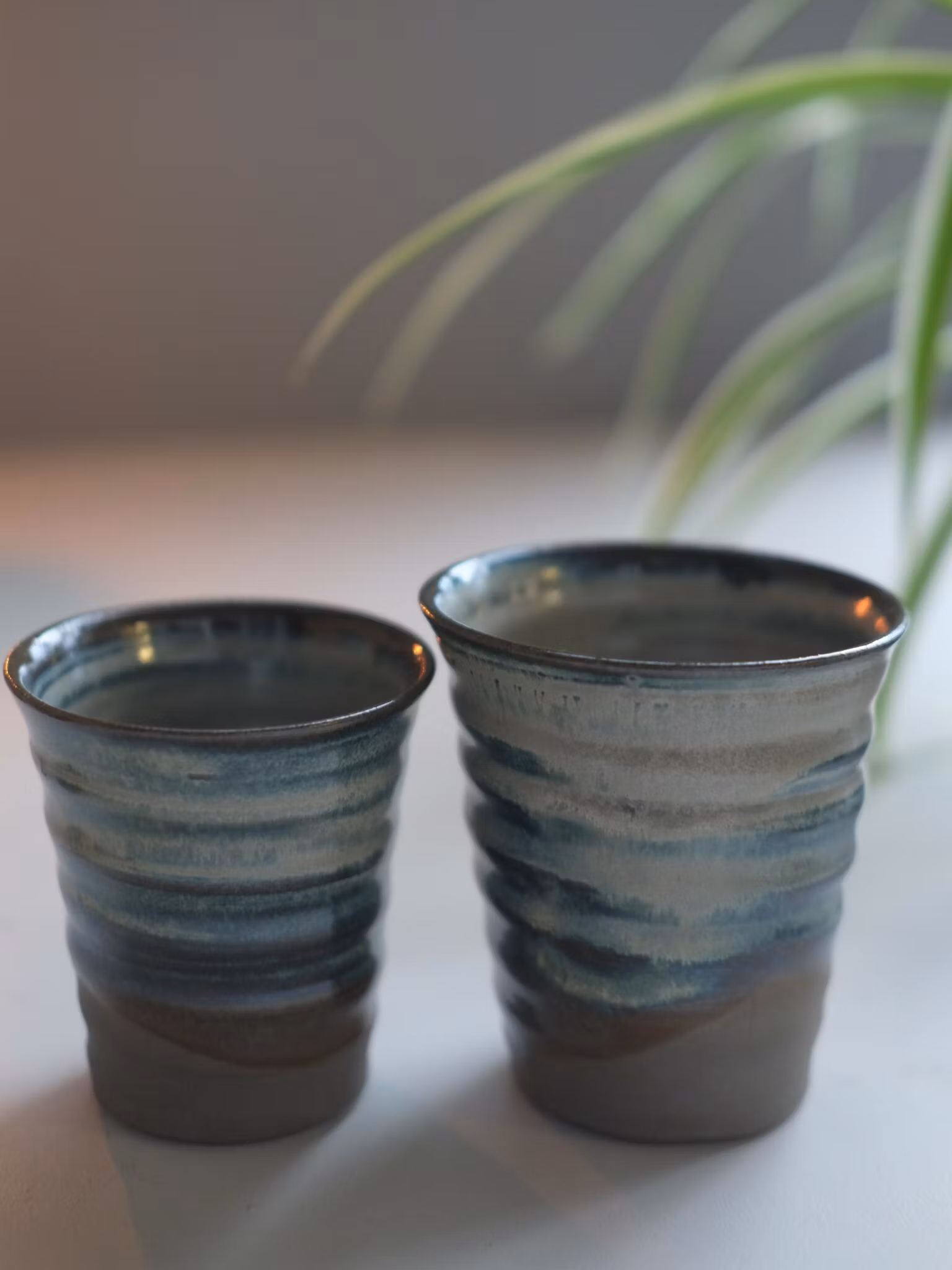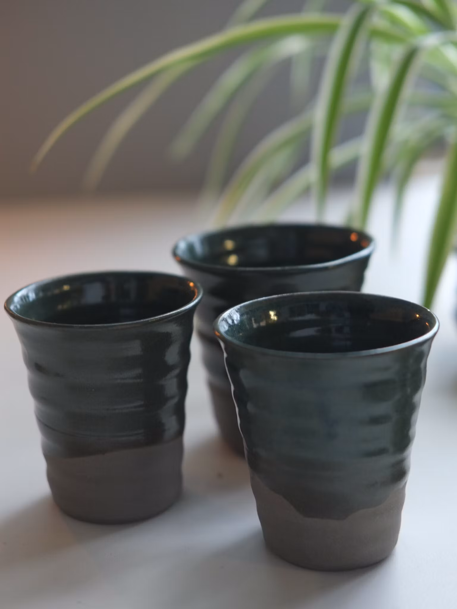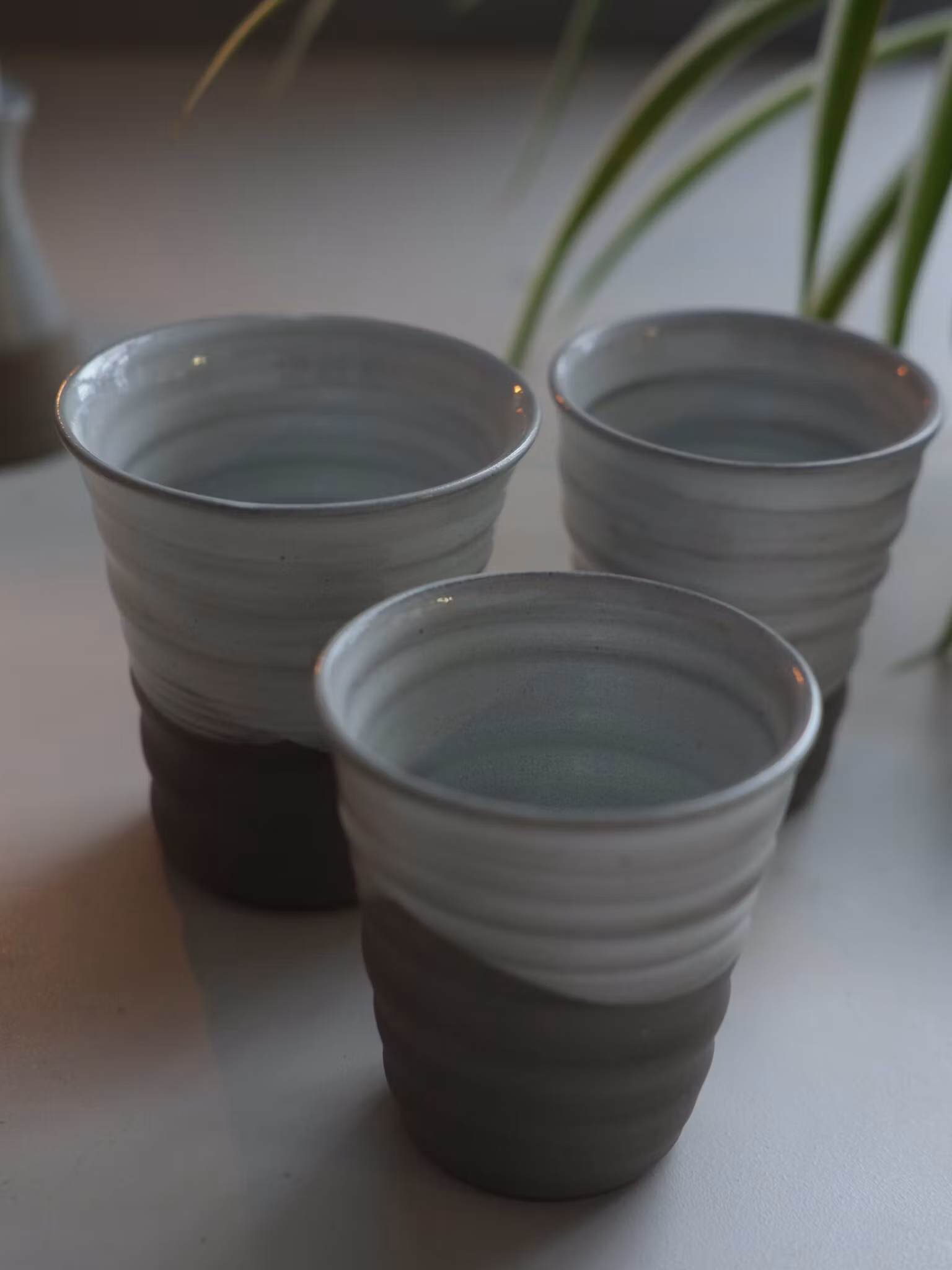 Drejade koppar i Antracitgrå stengodslera. De framhävda drejränderna ger en trevlig känsla i handen.