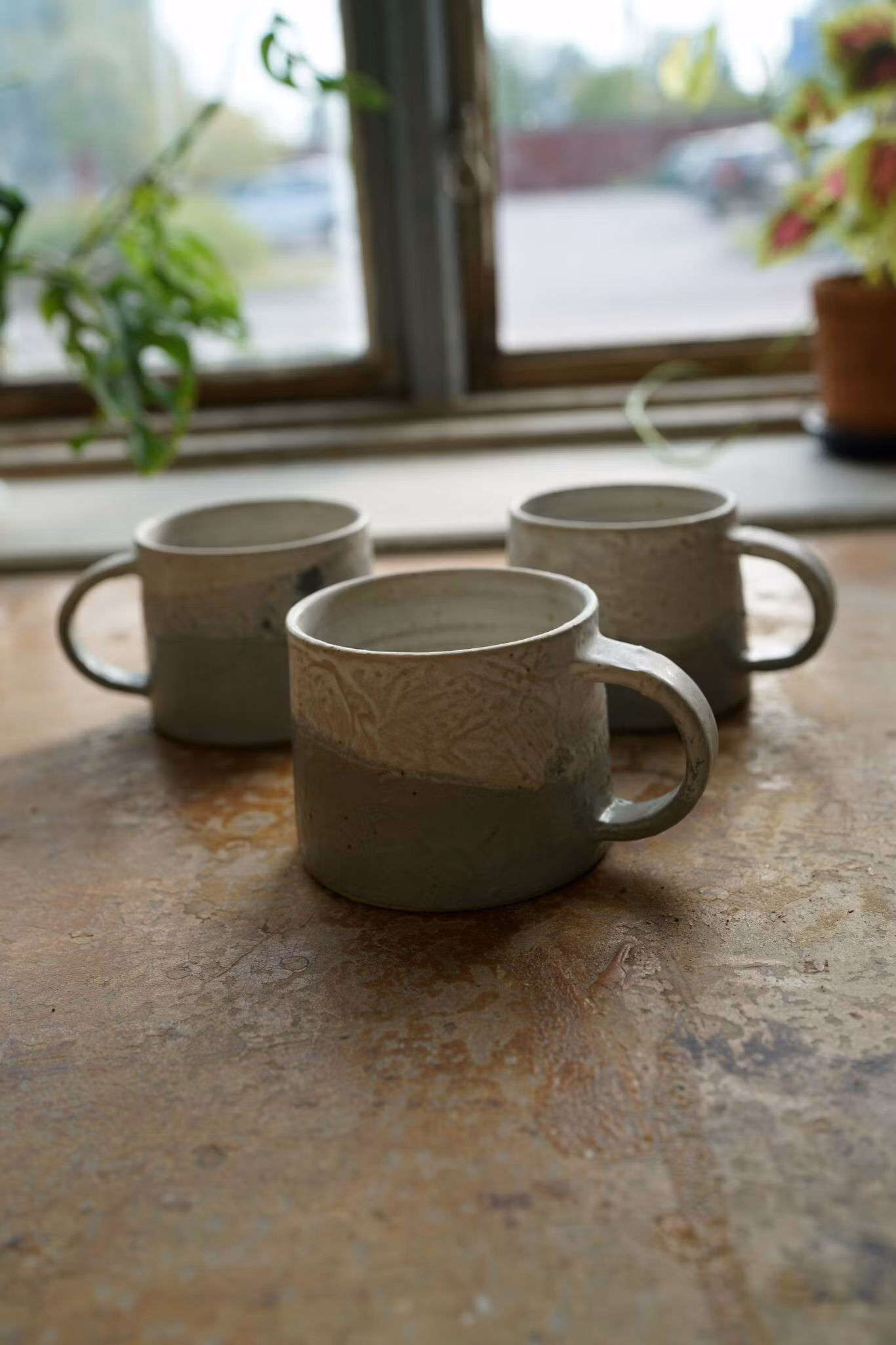 Drejade koppar i stengodslera. Härliga halvmatta glasyrer över en skrovlig struktur på koppen ger en trevlig känsla i handen.
