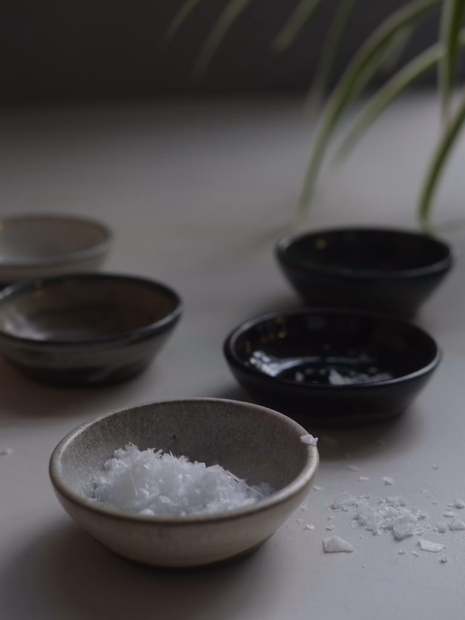 Mått: höjd ca 3 cm, inre diameter upptill ca 7,5 cm. Skålen rymmer ca 40 g flingsalt.