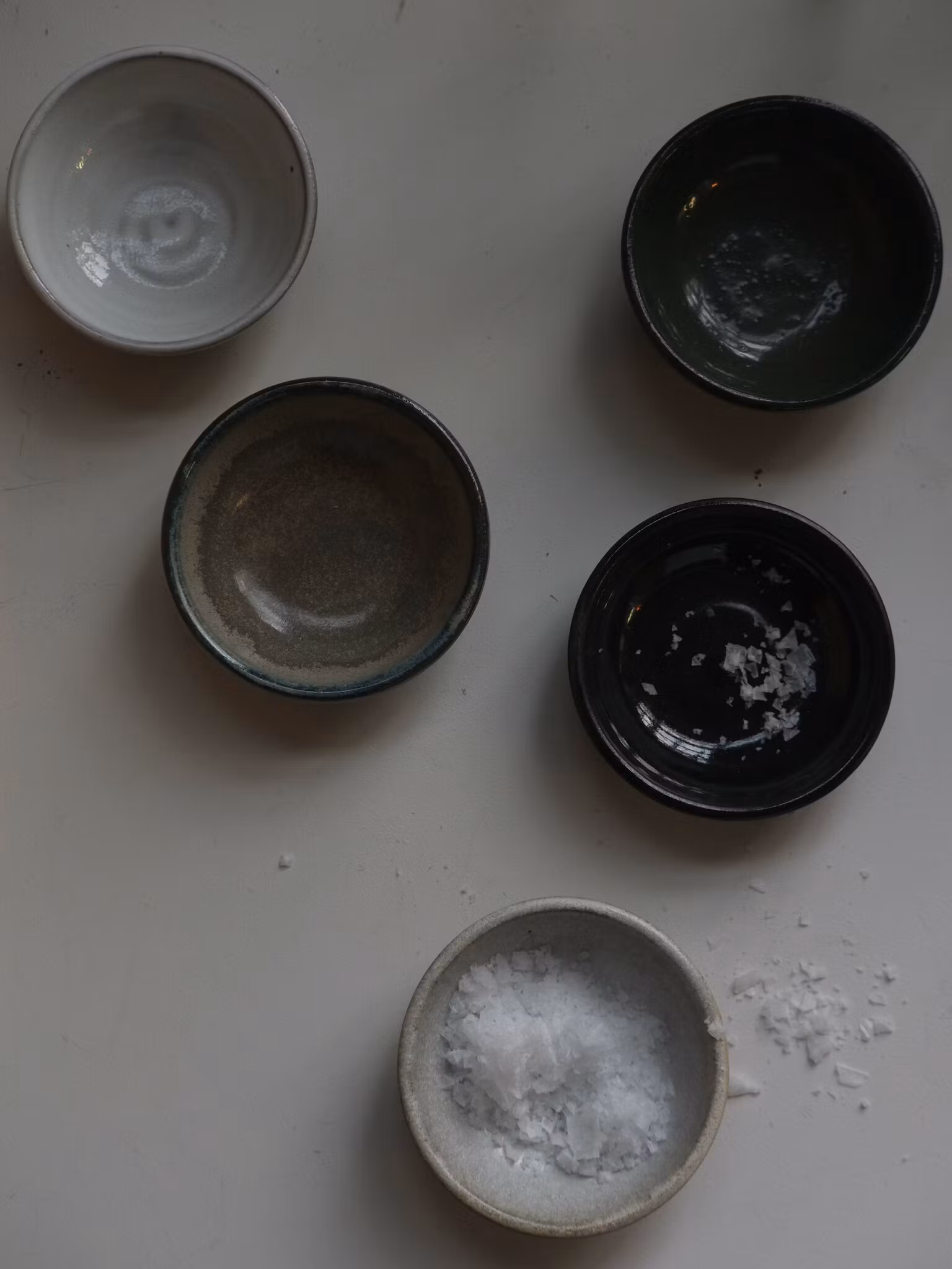 Drejade saltskålar i Antracitgrå stengodslera. Praktiskt vid spisen och snyggt att duka fram på bordet!